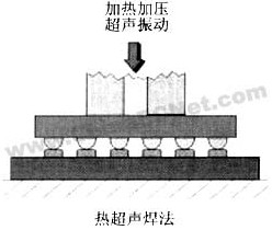 以芯片尺寸封装CSP为例:CSP的种类很多,有柔性封装CSP、刚性基板CSP、引线框架CSP、栅阵引线型CSP和微小模塑型CSP等。不同的CSP结构,其技术也不尽相同,但都是基于两项技术:倒装焊(FCB)和球栅阵列(BGA)。首先,倒装焊技术有3种电气连接方法:焊球凸点法(Solderbump),热压焊法(和热超声焊法)(图1.1)、导电胶粘接法(图1.2)。无论哪一种电气连接方式,凸点的连接在封装过程中都是不可见的。