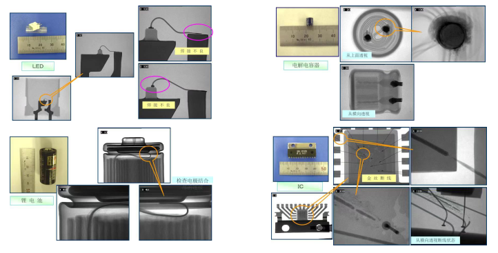 主要检测内容为:焊点检测(如SMT上的BGA、QFN、PLCC、电阻电容等焊点);内部结构检测(IC内部Bond Wire、Speaker等内部关键结构是否缺失损伤或到位等);关键尺寸测量测算;BGA气孔测量;锂电池极耳检测;其他电子元件的关键位置尺寸等等。部分检测图片(由日联科技X-RAY设备出图):