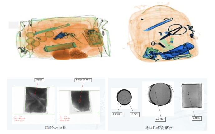 主要检测内容:安检(枪支弹药、管制刀具、易燃易爆物、危险化学品、有毒有害液体、毒品、珍稀动物等;食品(主要为内部检查及异物检查,有无腐烂,有无石头、贝壳、铁丝等);车检(日联科技推出应用于公安卡口、高速绿通、地下车库、物流园区、监狱等多种场景)。部分检测图片(由日联科技X-RAY设备出图):