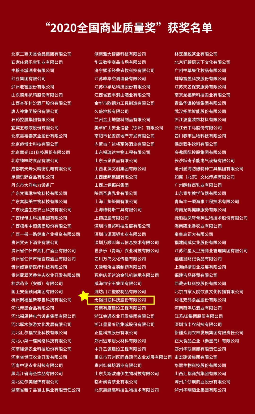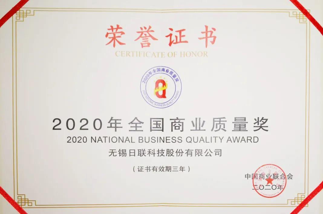 根据《全国商业质量奖评审管理办法》(试行)有关规定,经企业自愿申报、各地商业主管部门和行业协会推荐,全国商业质量奖评审办公室初步形式审查,并依据国家标准《卓越绩效评价准则》(GB/Z19580—2012)和《卓越绩效评价准则实施指南》(GB/Z19579—2012)技术文件,组织专家评审及获奖名单公示,决定授予无锡日联科技股份有限公司等126家单位“2020年全国商业质量奖”。
