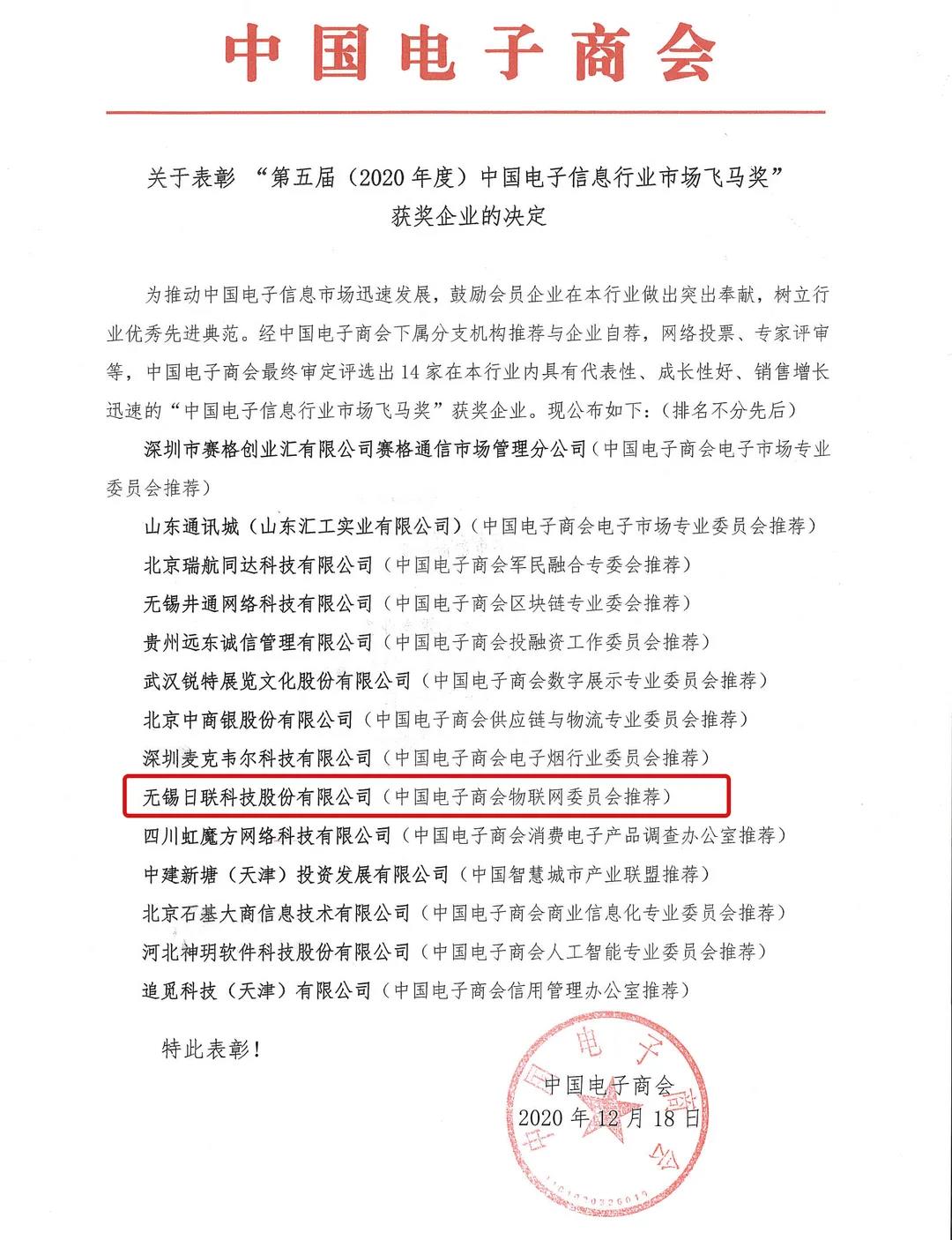 2020年12月18日,第五届(2020年度)中国电子信息行业市场飞马奖评选隆重揭晓,这是中国电子商会年度评选的**奖项,日联科技荣誉在列。