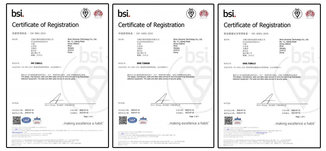 本次三大管理体系监督审核,在公司各部门的密切配合下,BSI(英国标准委员会)审核专家进行内部记录汇编审核及外业现场检查后,认定无锡日联科技股份有限公司组织管理体系持续有效运行,准予保持三体系认证注册资格。